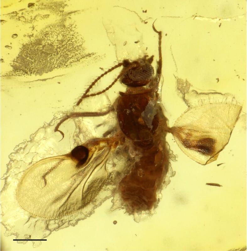 Die Gnitze ist in Bernstein eingeschlossen. An den Flügeln sind die „Taschen“, die vermutlich als Ph … (Foto: Frauke Stebner/Steinmann Institut, Uni Bonn)